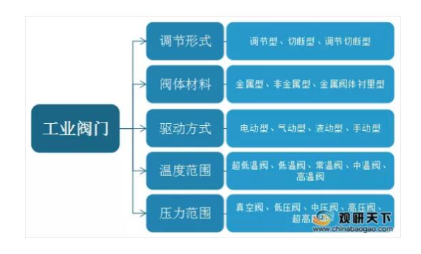 1、工業(yè)閥門是一種工業(yè)管路上控制介質(zhì)流動(dòng)的重要附件,可用于控制空氣、水、蒸汽、各種腐蝕性介質(zhì)、泥漿、油品、液態(tài)金屬和放射性介質(zhì)等各種類型流體的流動(dòng)。工業(yè)閥門可以根據(jù)不同的標(biāo)準(zhǔn)來(lái)分類,根據(jù)調(diào)節(jié)形式可分為調(diào)節(jié)型、切斷型、調(diào)節(jié)切斷型;根據(jù)閥體材料可分為金屬型、非金屬型、金屬閥體襯里型;根據(jù)驅(qū)動(dòng)方式可分為電動(dòng)型、氣動(dòng)型、液動(dòng)型、手動(dòng)型;根據(jù)溫度范圍可分為超低溫閥、低溫閥、常溫閥、中溫閥、高溫閥;根據(jù)壓力范圍可分為真空閥、低壓閥、中壓閥、高壓閥、超高壓閥。
